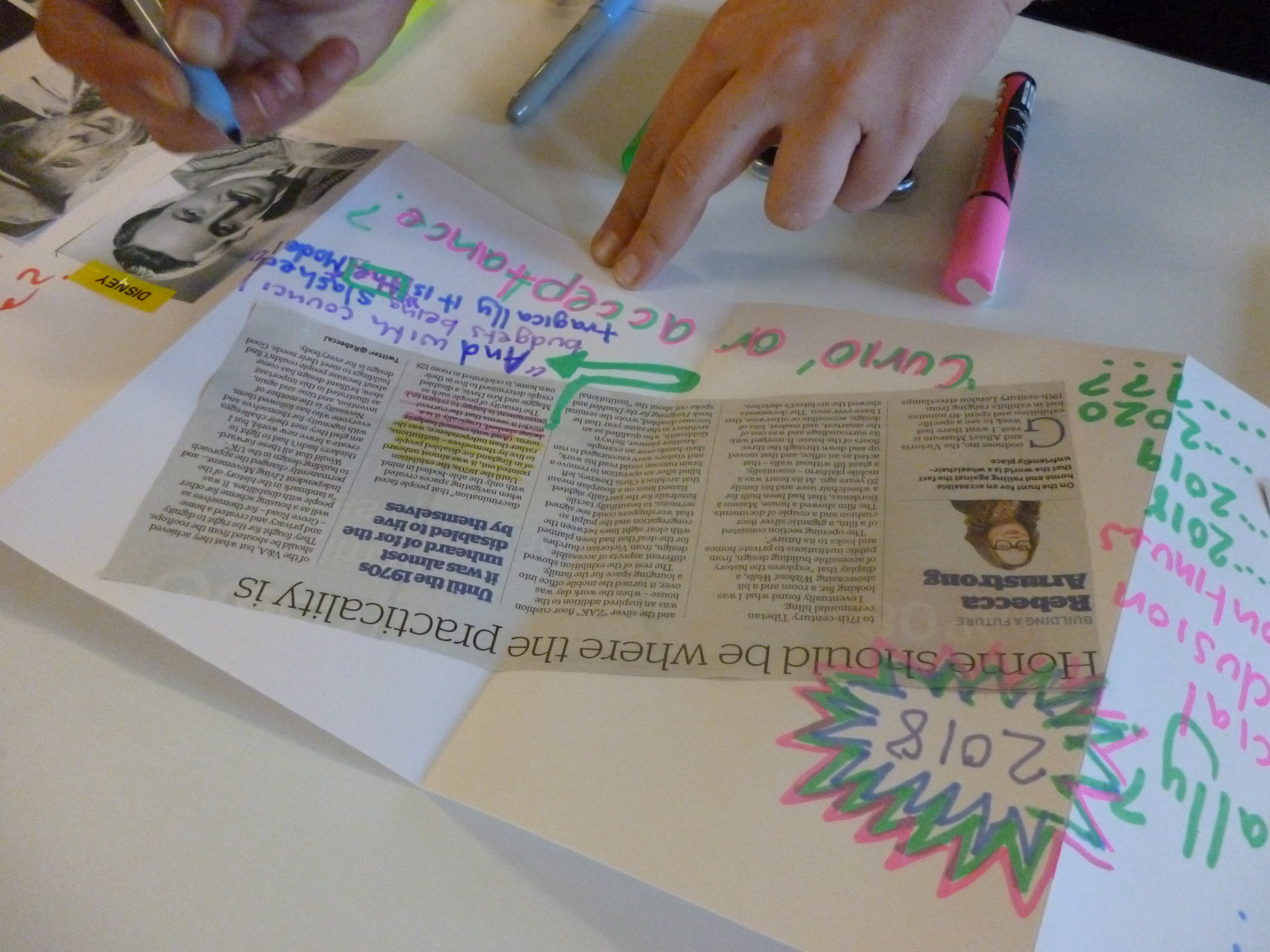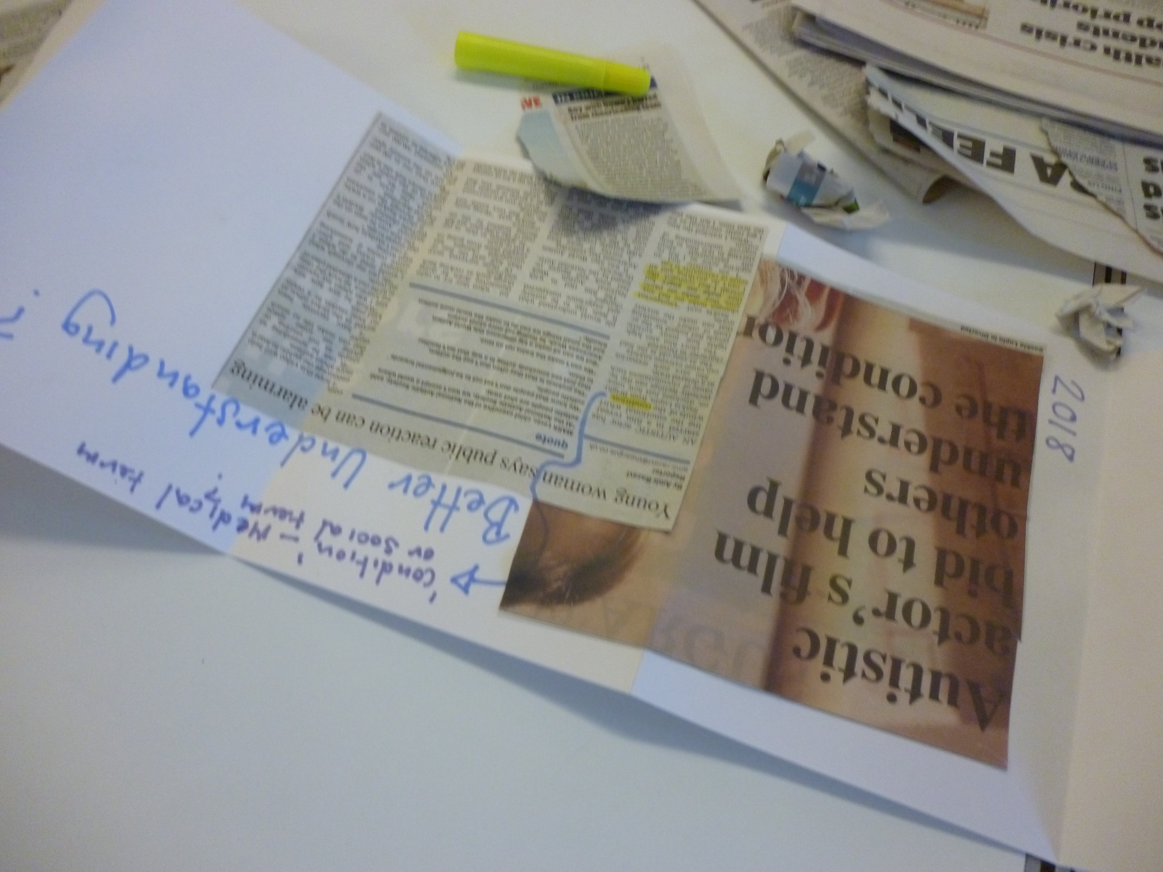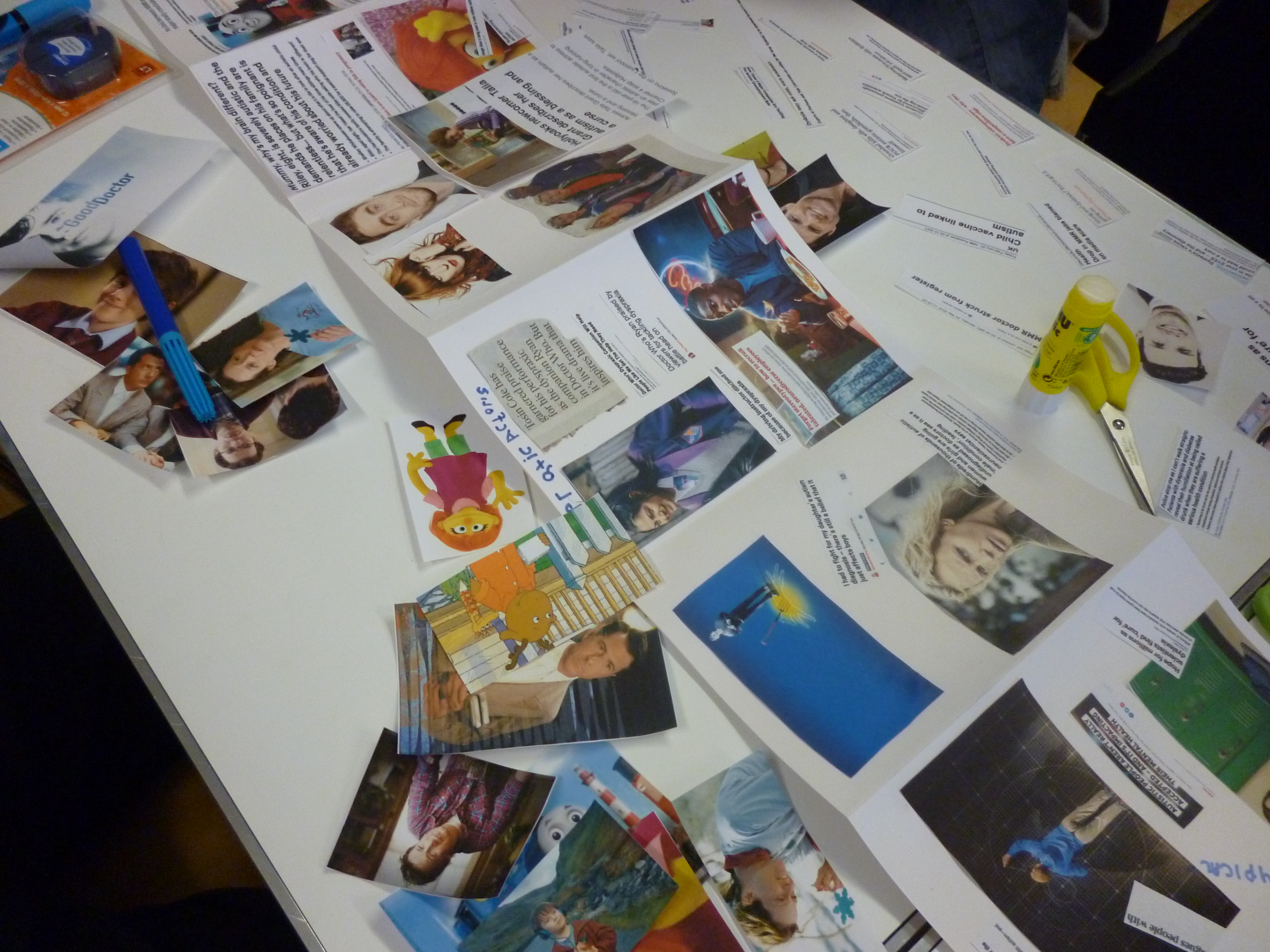For the third session I laid out a concertina book across a table with images of neurodiverse celebrities, TV and film characters and newspaper headlines. Participants also brought along headlines. Together we made a ‘comic book’ of neurodiversity looking at how neurodiversity is portrayed in the media.