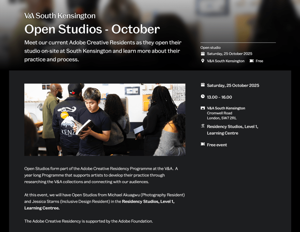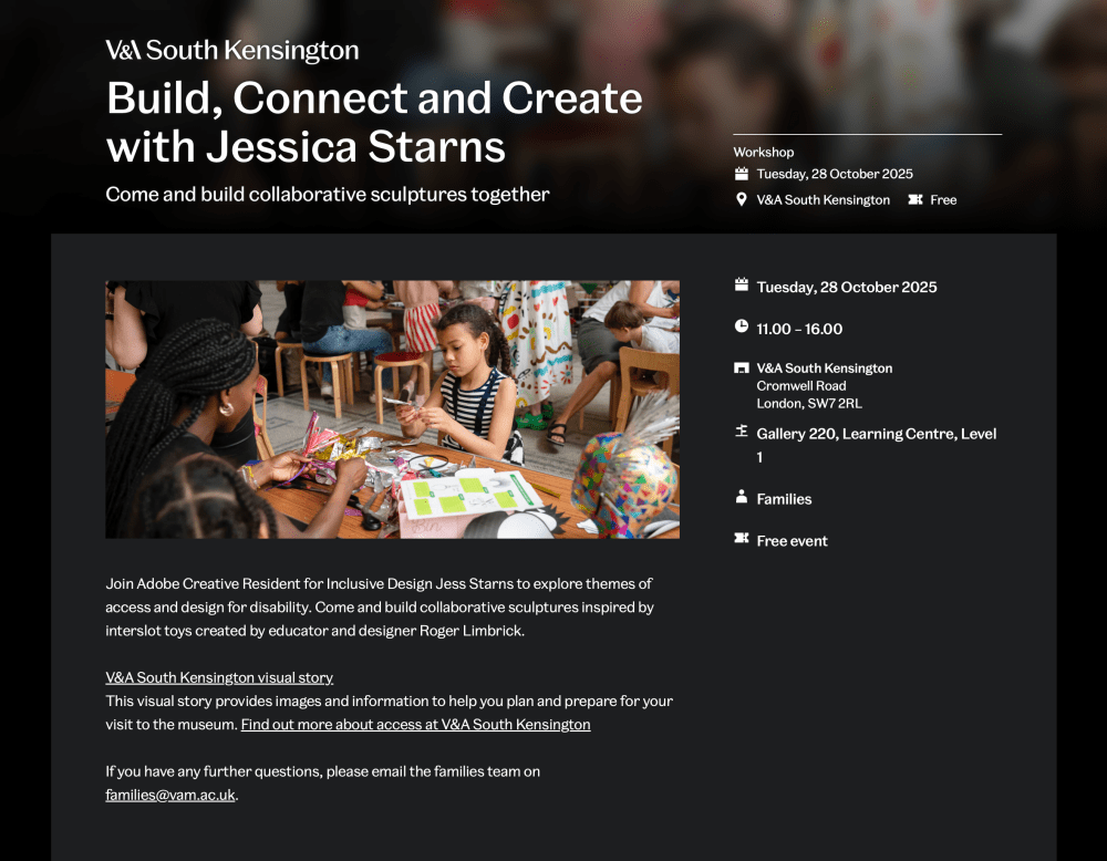 As Adobe Creative Resident: inclusive design at the V&A Museum 2025 running alongside the Design and Disability exhibition. I worked for 11 months at the V&A within the Learning department and other programming teams. Below is a selection of various images from events during the year.