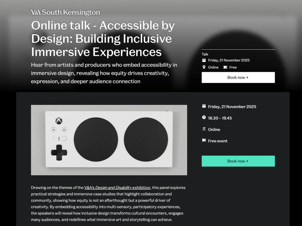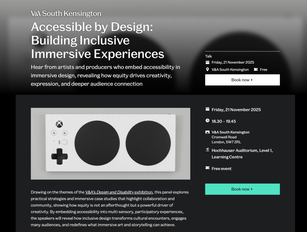 Accessible by Design: building inclusive, immersive experiences panel talk. I devised and list of speakers and spoke alongside: Natalie Kane, V&A Curator, Digital Design ( chair), Sacha Wares, Theatre/XR Director and Founder of Trail and Error Studio, Harshadha Balasubramanian, Anthropologist at UCL and Digital Access Consultant in Arts and Heritage, Ben Glover, Creative Captioner, Ashley James Brown, Artist, Educator and Creative Technologist.