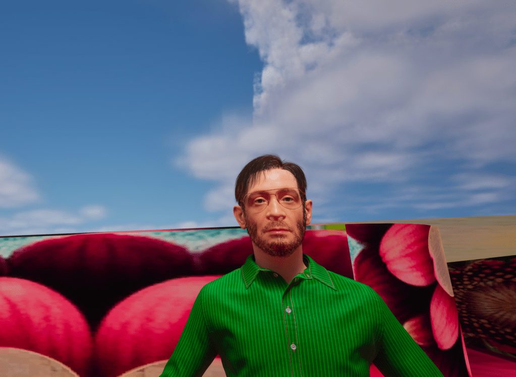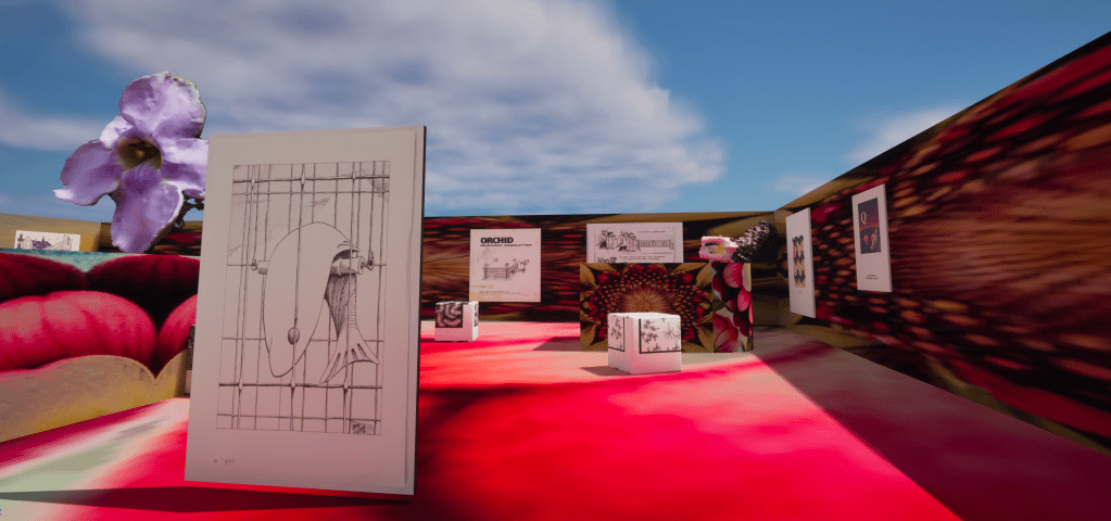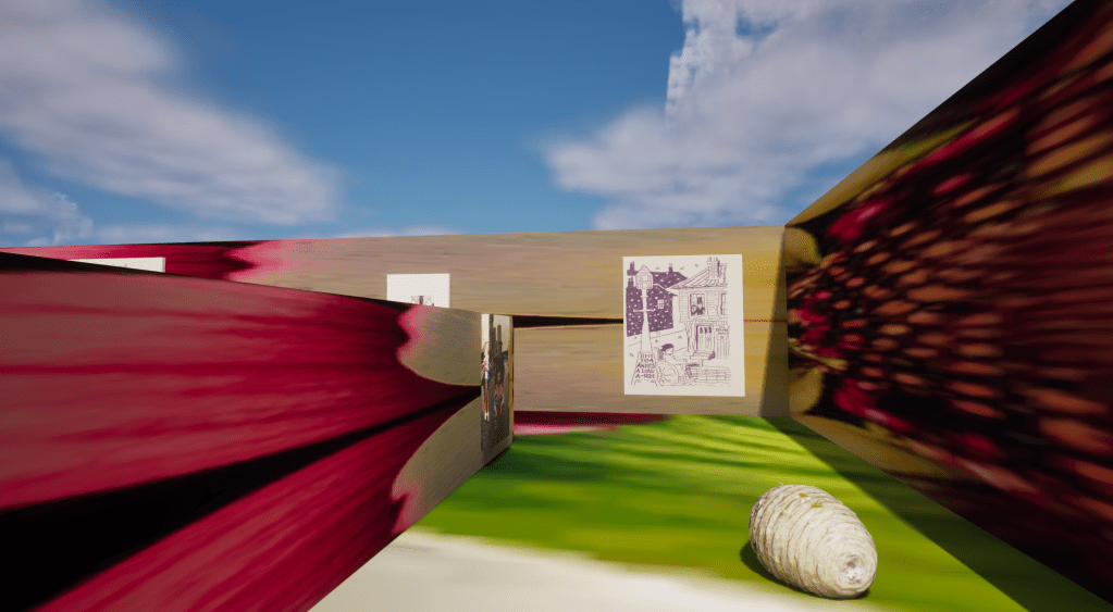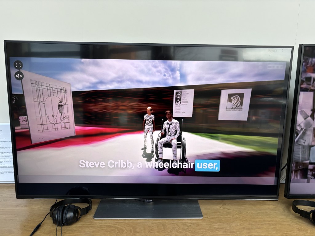 In the exhibition you will see a recorded video game play where Cribb and I are Metahumans, my character helps you navigate the space. You can also hear AI generated recordings of Cribbs disability focused essays and hear Collective member Noor-e’s as well as my own audio descriptions.