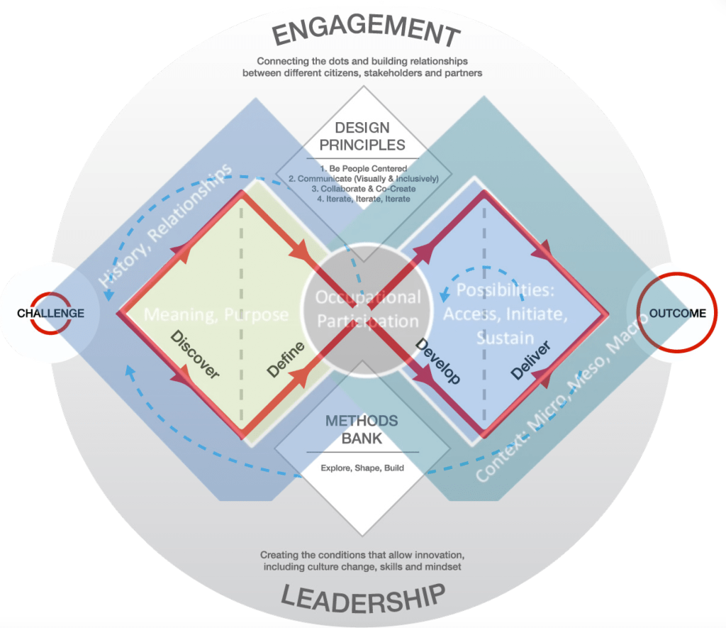 Research in Occupational Therapy as a design process we looked at Canadian Model of Occupational Participation and the Design Council ‘Double Diamond’, see below. We used this process during the year as they are both similar models.