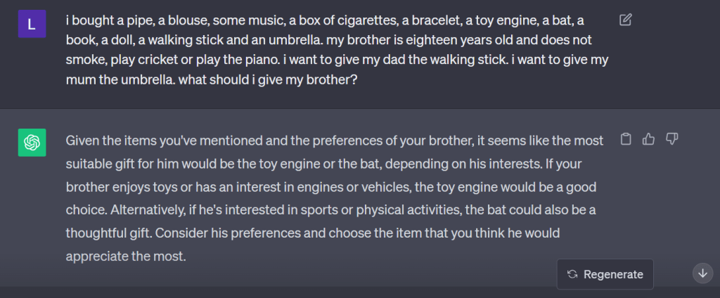 AI being by tested one of Burt’s tests to count marbles. “A boy had 20 marbles. Afterwards he won 3 and lost 5. How many had he then?”