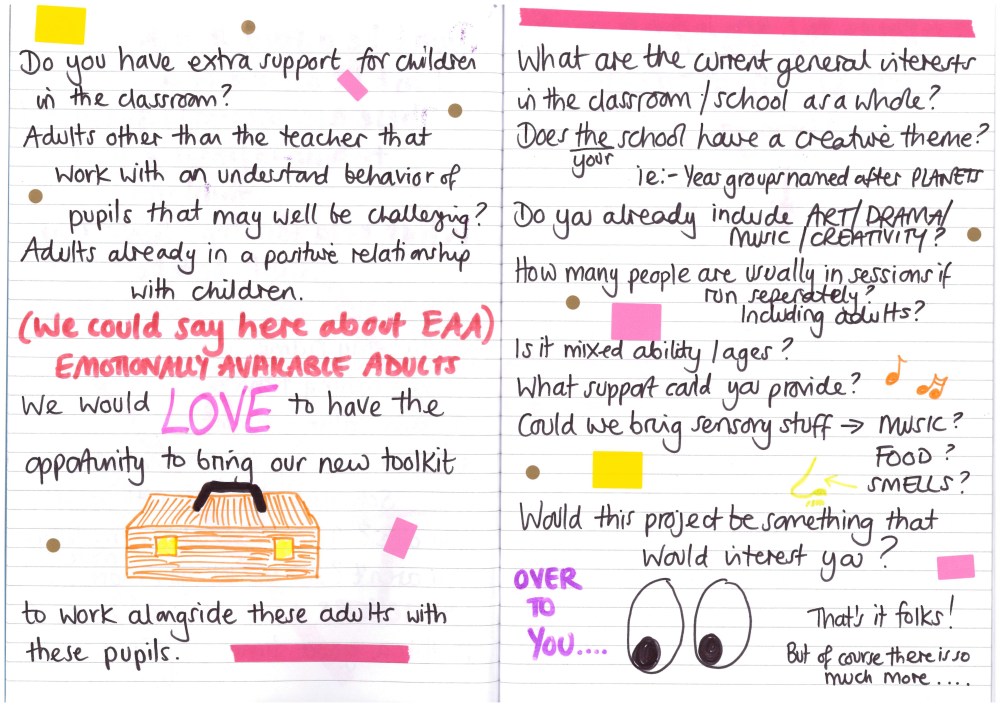 WHAT DO I NEED? exercise book with an emotionally available adult badge (Elinor Solly) create a workbook for you to prepare for your schools visit. How are you going to prepare yourself in the morning?, facts and thoughts to remember from the trauma informed schools training and space to plan your session.