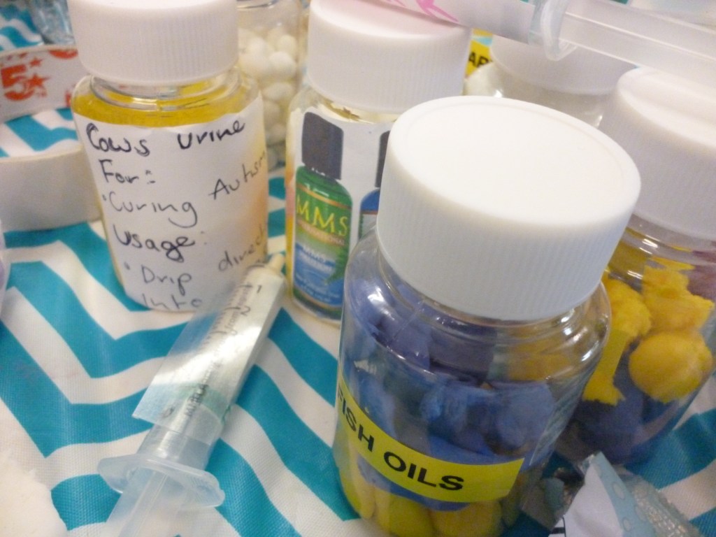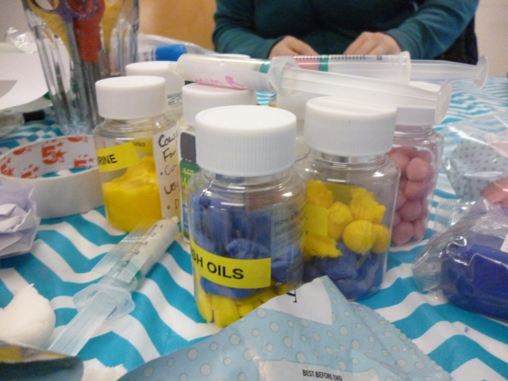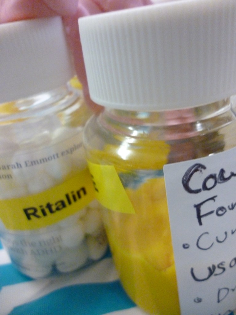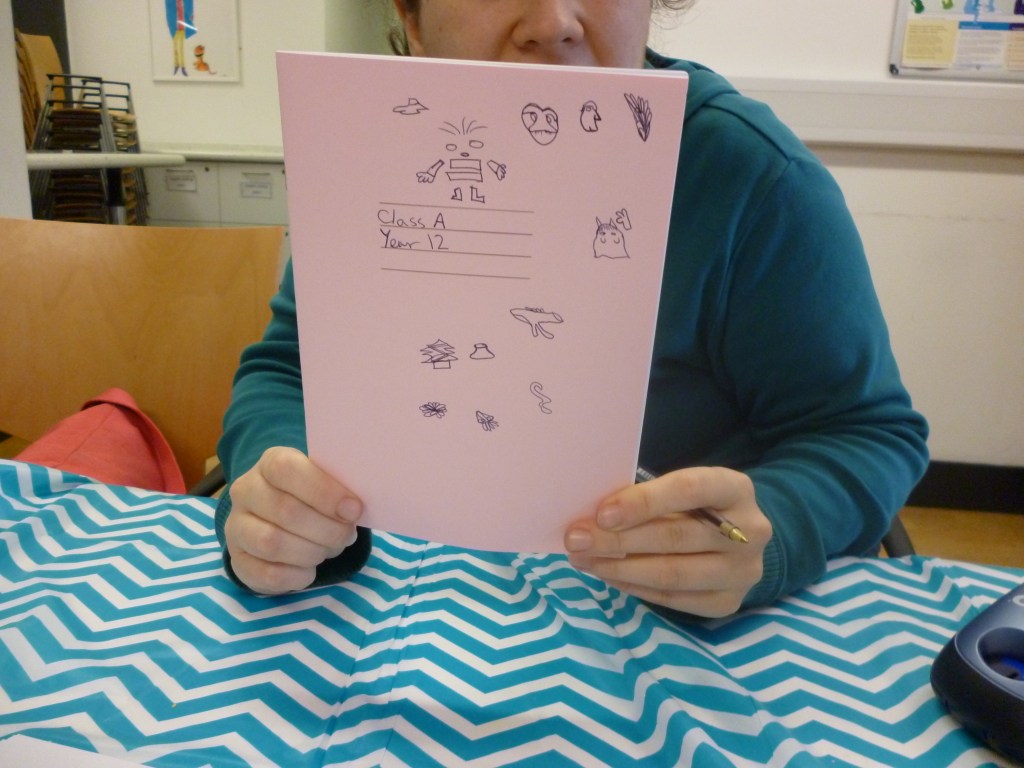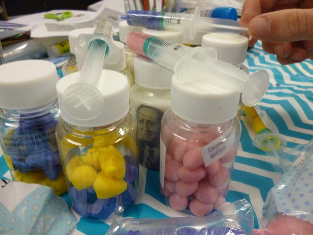For the fourth session we looked at curing and looked at the Westminster Commission on Autism research on cures parents have been offered. We used icing sugar to make the medicines. Then we looked at education and decorated exercise books with our memories of schooling.